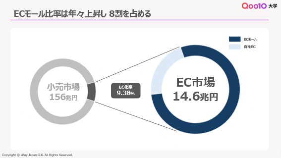 セミナーではeBay Japanが、3つのテーマを設定して講演した。最初のテーマは、「EC市場の傾向」。参加者にはその成長スピードはもとより、「EC市場の約80%がECモールが占めている」という事実が示された。
