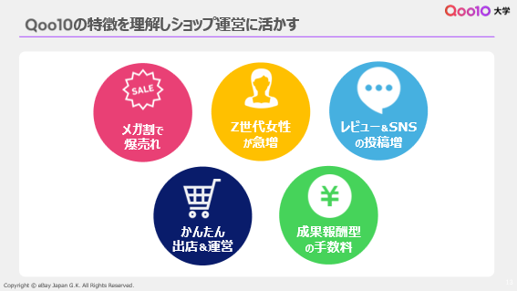 2つ目のテーマは、「Qoo10の5つの特徴」。①メガ割などの独自マーケティング施策、②Z世代の女性からの圧倒的な支持、③レビューやSNSの投稿が多いこと、④出店や運営が簡単、⑤成果報酬型の手数料体系の5つの柱によって成長し、市場での認知度を高めてきた秘訣を解説した。複数の参加者から「Qoo10にはなぜ若い消費者やレビューが集まるのか」という質問が寄せられ、Qoo10が持つ独自性への関心は高く、説明を通じて納得した様子だった。