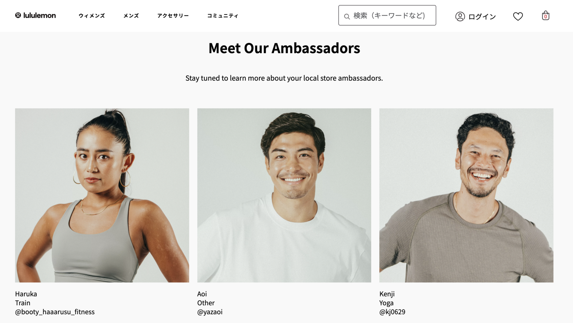 ストア内にアンバサダーページを設ける場合もあります。LululemonやThe North Faceでもアンバサダーを紹介するページを運用しています。