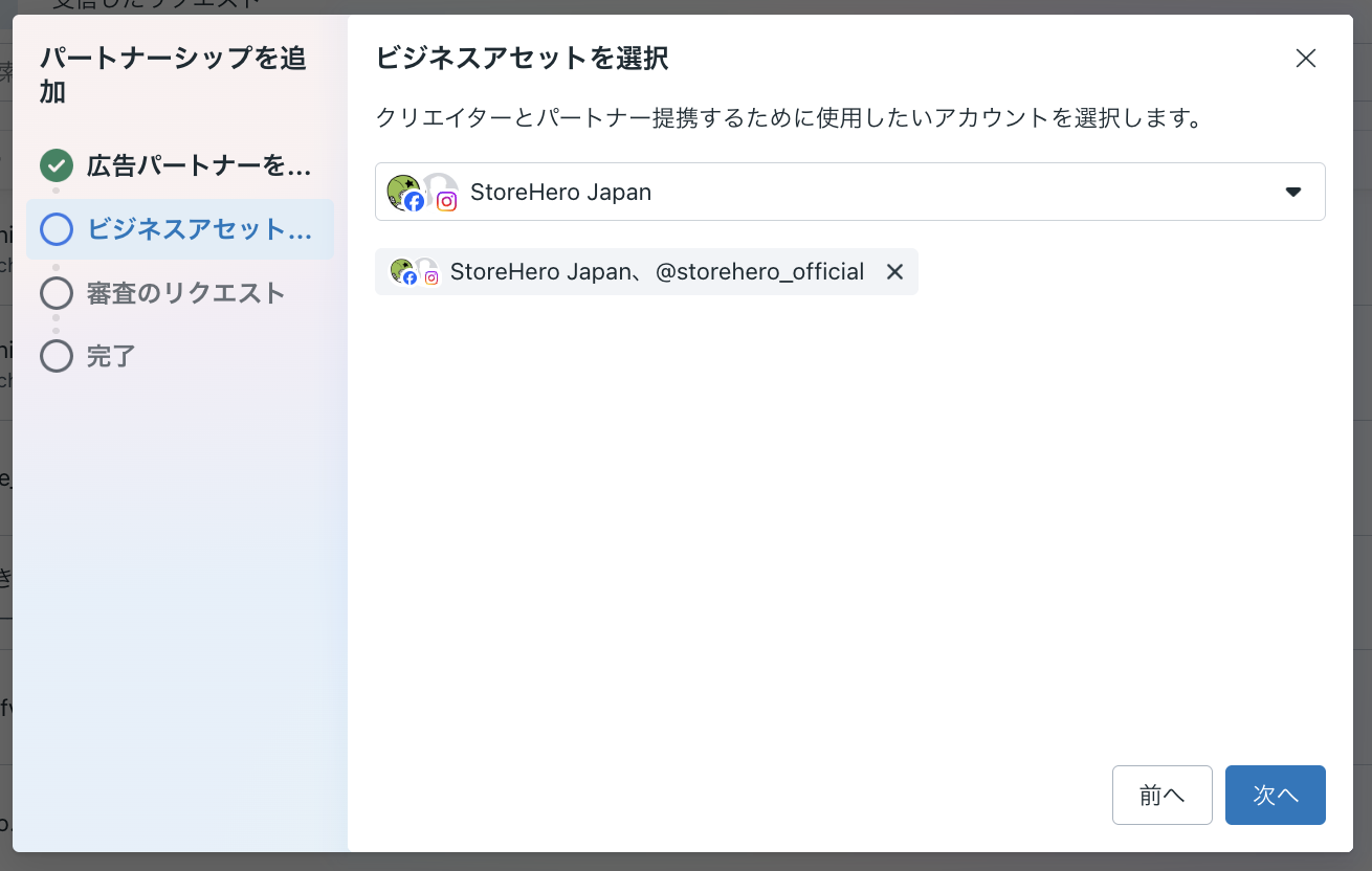 連携させるビジネスアセットを選択して審査のリクエストをします。