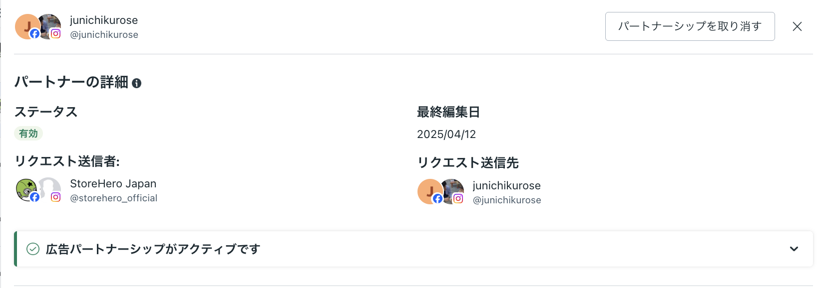 クリエイターが承認をしてくれるとステータスが「有効」になり、パートナーシップ広告で広告パートナーと連携した配信ができるようになります。