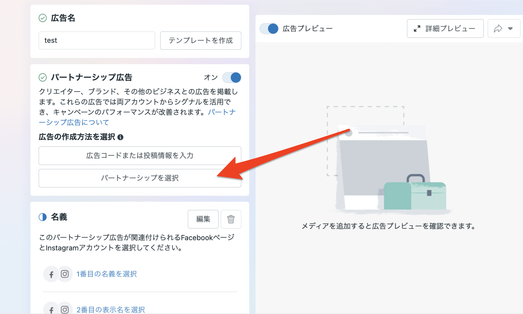 パートナーシップ広告の配信は、まず、広告設定の画面で、パートナーシップ広告をオンにして、パートナーシップを選択します。