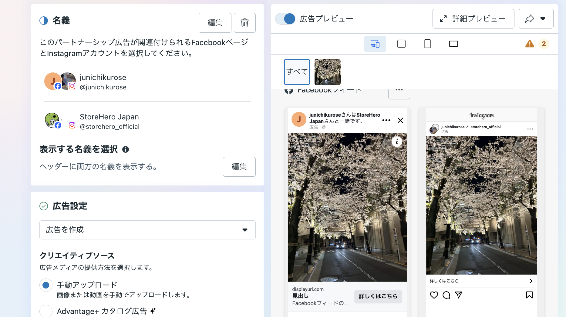 パートナーシップを選択すると、選択されたパートナーと併記で名義が表示されるようになり、パートナーの投稿を広告クリエイティブとして選択できるようになります。