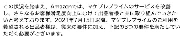 「2021年7月15日以降、従来の要件に加え、以下の3つの要件を満たさなければマケプレプライムは利用できなくなる」というのです。