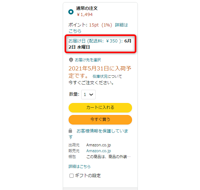 商品ページにある「注文の出荷予定日(お届け日)」は、出荷作業日数が影響しています。