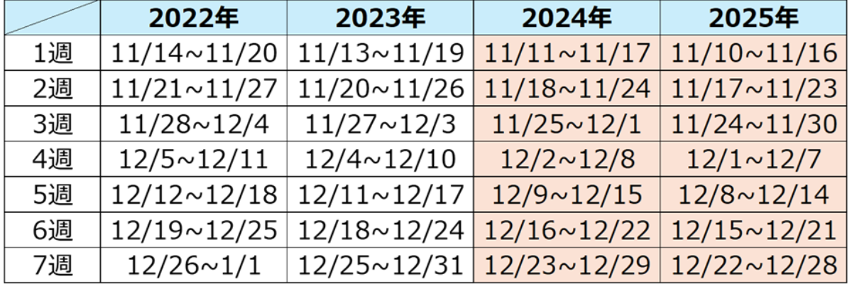 年末商戦を「週別」で分析します。(※図1:各年度の年末までの週別定義を参照)2024年と2025年の週の日付は類似しているため、2024年の動向が参考になります。