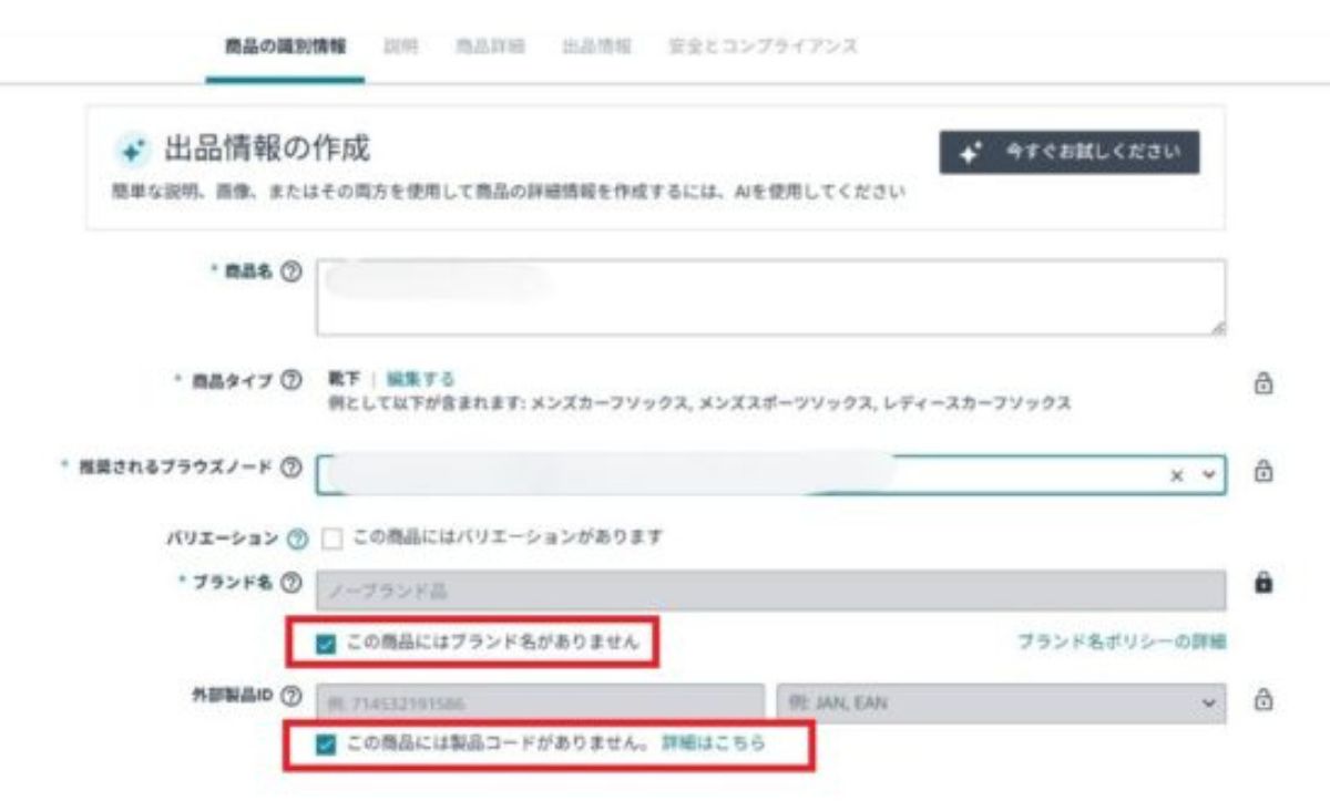 商品の識別情報の「この商品にはブランド名がありません」にチェック