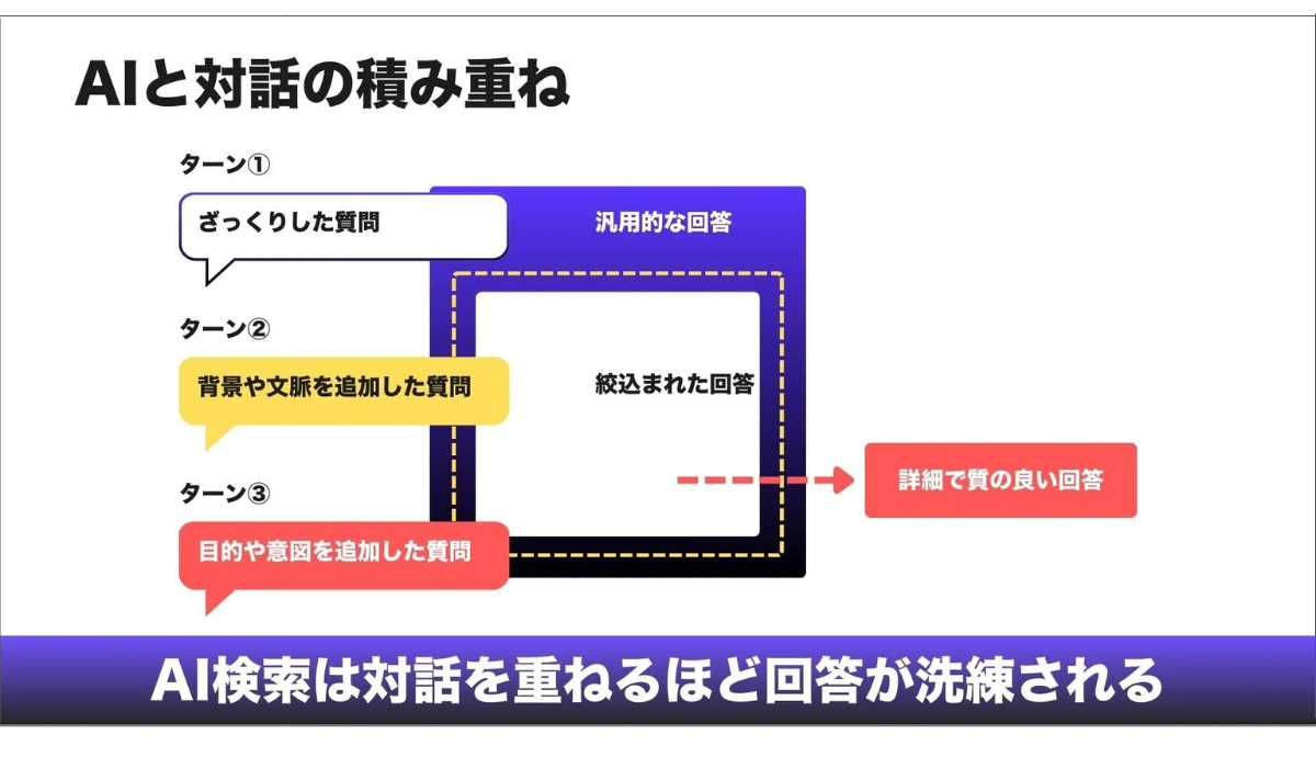 しかし生成AIの時代では、検索は反復的に進みます。ユーザーは広い質問から始め、追加のプロンプトによって徐々に絞り込んでいきます。