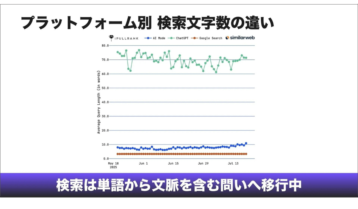 AI検索が成熟するにつれ、キーワードよりも具体性が重視されるようになります。現在のユーザーは、Google検索より多くの言葉を使いながらも、ChatGPTほど長い入力は行っていませんが、行動変化はすでに始まっています。