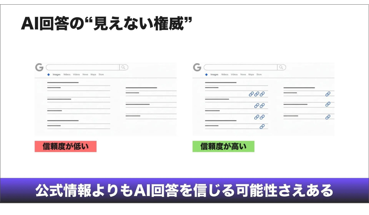 近年の検索行動に関するユーザー調査では、重要な傾向が明らかになっています。ユーザーは、従来の検索リンクよりも、AIが生成した要約結果を信頼する傾向があります。