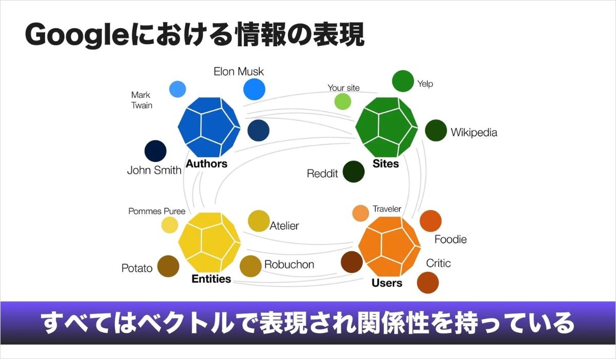 Google Knowledge Graphでは、あらゆる対象がエンティティとして整理されています。エッフェル塔から特定ブランドの商品まで、これらは多言語かつマルチモーダルな情報としてベクトル化されています。
