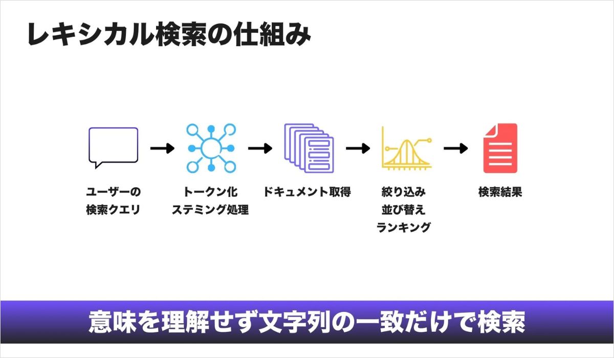 長い間、検索の中心はレキシカル検索でした。これは文字列をそのまま比較する検索方式で、ページ内にどの単語がどれだけ出現しているかを評価します。