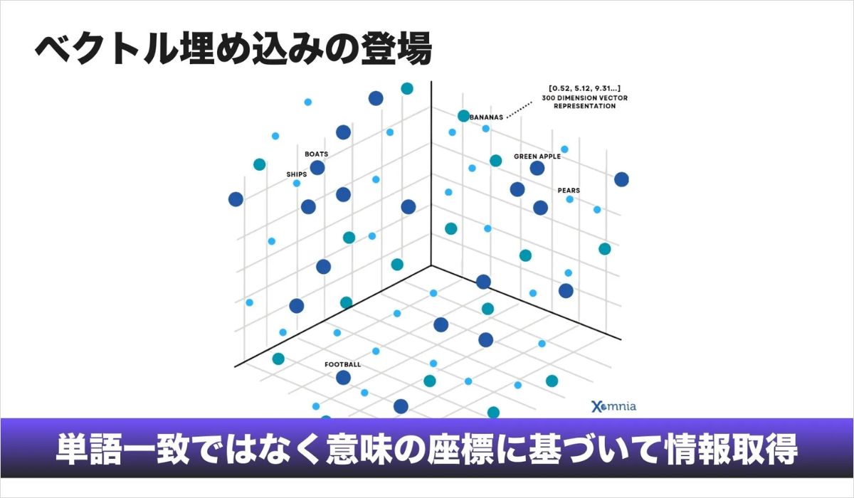 語句一致検索の問題を解決するために登場したのが、Embeddings(埋め込み表現)です。