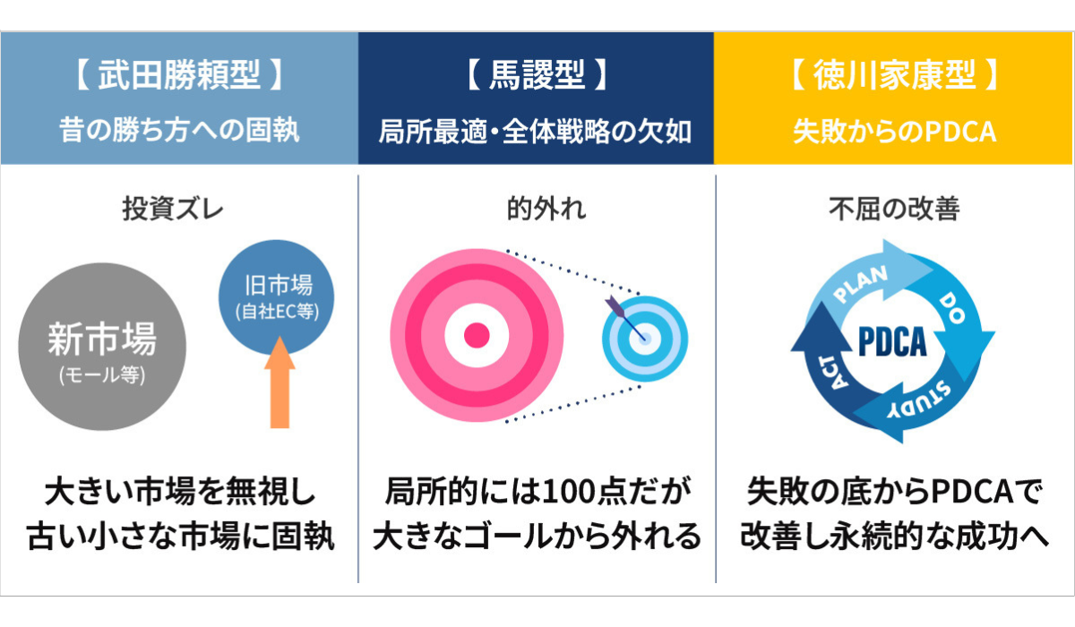 武田家の強みだった騎馬隊は、織田・徳川の鉄砲部隊に敗北しました。ECで言えば、市場構造が変わったのに昔の勝ち方を続けてしまう状態。例えば、モール市場が大きくなっているのに自社ECだけに投資を集中する――それは構造的に厳しい戦いです。