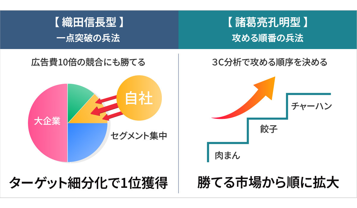 例えば【月100万円の広告費を使う】競合に対して、【月10万円の広告費】で勝つ。冷静に考えると、あり得ない話です。では、なぜ織田信長は勝てたのか。これはランチェスター戦略で説明できます。つまり、兵力で勝てる一点を作り出したのです。