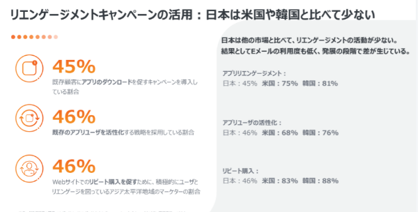 日本ではアプリの利用を促すアプローチは米国や韓国に比べ、5割を切っているのが現状。