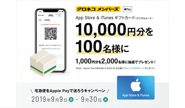 また同社は2019年9月9日(月)から9月30日(月)の間、「宅急便はスマホで送れる。」を利用して宅急便を発送する際に、Apple Payで支払ったクロネコメンバーズに、抽選でApp Store & iTunes ギフトカード(デジタルコード)をプレゼントするキャンペーンを実施する。さらに対象者全員にTポイント100ポイントがもれなくプレゼントされる。