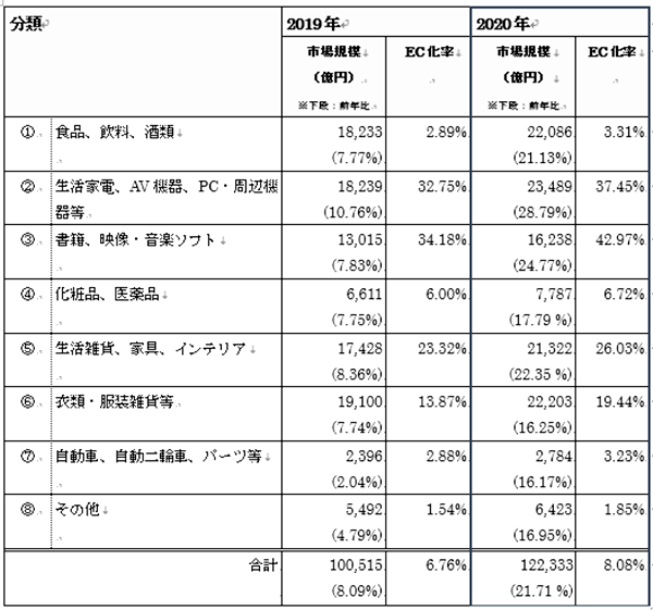新型コロナウイルス感染症対策として、外出自粛やEC利用が推奨された結果、物販系分野の大幅な市場規模拡大につながった一方、主として旅行サービスの縮小に伴って、サービス系分野の市場規模は大幅に減少した。
