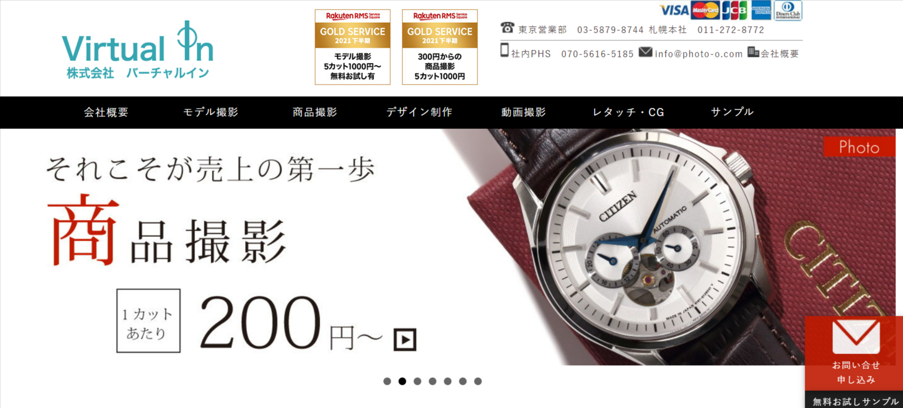 株式会社バーチャルインは無料お試し撮影ができる商品撮影代行会社です。撮影料金の設定は1枚300円〜、最低発注金額3,000円〜依頼することができます。また単発のプラン以外にもモデル込みの撮影取り放題プラン198,000円〜があります。月間100商品以上商品をコンスタントに撮影したい企業におすすめのプランで、1商品につき最大1,320円お得です。株式会社バーチャルインの特徴は無料お試し体験ができる点なので、まずはお試しで利用しクオリティを確かめたいという方へおすすめの企業です。