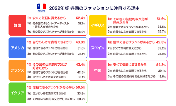 一方、「アメリカ」は「自分らしさを表現できるから」(43.3%)、「フランス」と「イギリス」は「その国の伝統的な文化が好きだから」(「フランス」43.4%、「イギリス」51.6%)、「イタリア」と「スペイン」は「信頼できるブランドがあるから」(「イタリア」50.5%、「スペイン」42.3%)が最も多い結果となった。