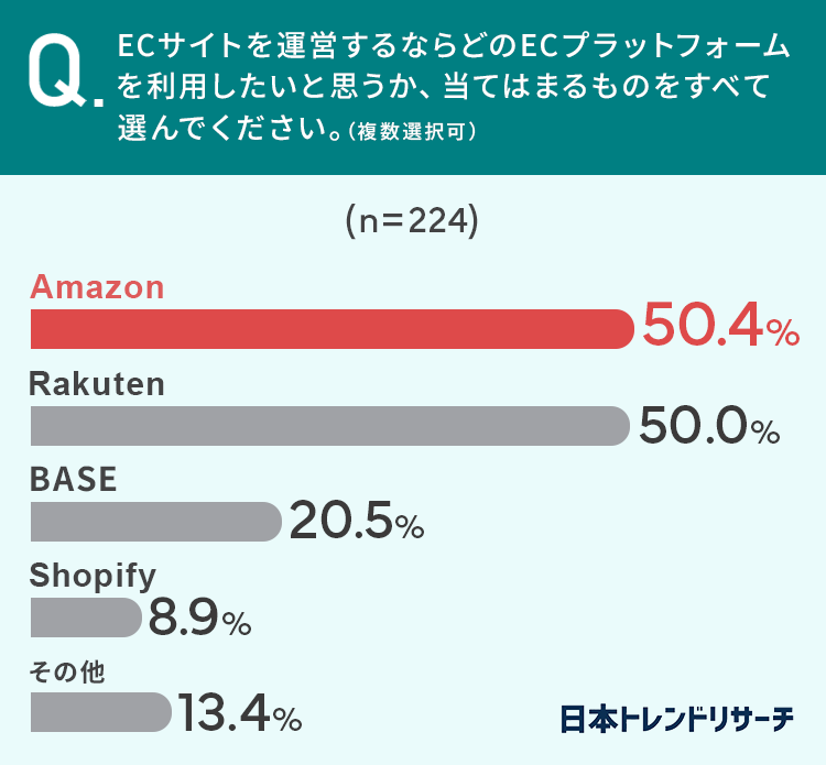 ECサイトを運営するならどのECプラットフォームを利用したいと思うについては「Amazon」が50.4%、「Rakuten」が50.0%と半数を占める結果となった。