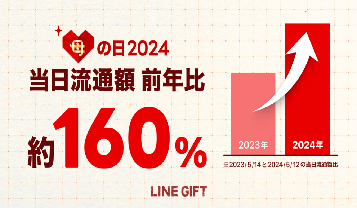 LINEヤフー株式会社が提供する「LINEギフト」は、2024年の「母の日」当日の流通額が前年比約160%となり、1日における流通額と利用者数の過去最多を更新したことを公表した。