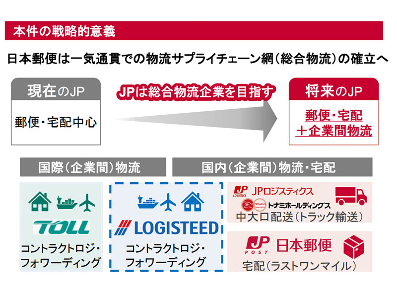 今回の資本業務提携を契機に日本郵便およびグループ物流各社(JPロジスティクス株式会社、トナミホールディングス株式会社、Toll Holdings Pty Limited)は、ロジスティードのリソースとノウハウを組み合わせ、ラストワンマイルから国内・国際物流までを一気通貫で担う総合物流体制を構築する。