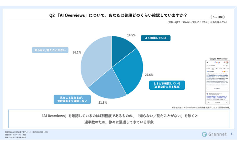 Google検索結果に表示される「AI Overviews(AIによる概要)」について、「よく確認している」「ときどき確認している」と回答したユーザーは全体の42.1%を占めた。