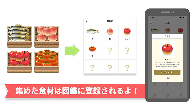 集めた食材は「図鑑」に登録される。食材のイラストをタップすると食べチョクで販売されている商品一覧ページ(ECサイト)を見ることもでき、ゲームと実際の買い物体験をつなげる。