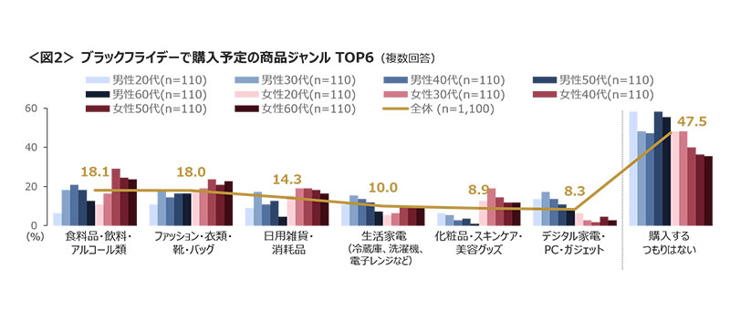 今年のブラックフライデーで購入予定の商品ジャンルは「食料品・飲料・アルコール類」「ファッション・衣類・靴・バッグ」「日用雑貨・消耗品」が上位3位を占め占めた