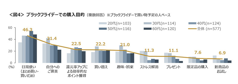 年代があがるほどブラックフライデーの認知率は高くなり、50代・60代では9割を超えた。ブラックフライデーでの買い物経験は30代・40代で4割を超え、他の年代より高い傾向がみられた。