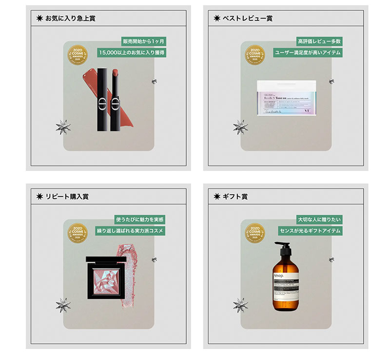 ZOZOCOSMEならではの視点で選出したコスメに贈る特別賞「ZOZOベストコスメ」では、以下のアイテムが選出された。