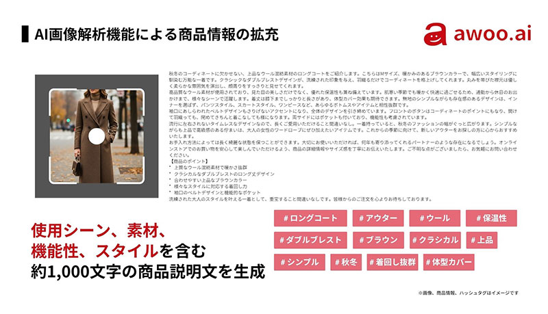 ※画像元:AIによる商品説明文自動生成機能「awoo Description Writer」を提供開始(awoo株式会社)