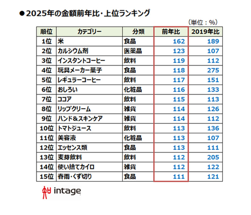 株式会社インテージは2025年12月9日、日用消費財の中で何がより売れたかを、推定販売金額の伸びから振り返る「2025年、売れたものランキング」を発表した。