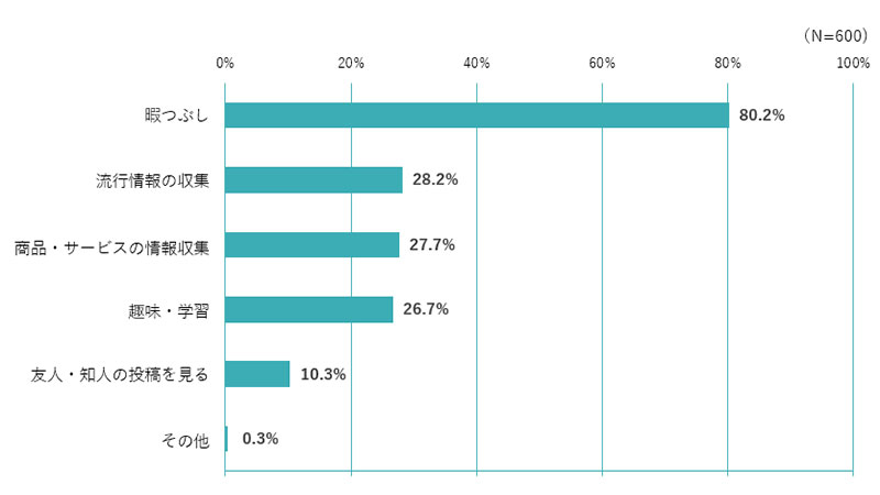 ショート動画を「普段どのような目的で視聴しているか」を選択肢からの複数回答可で質問したところ、80.2%が「暇つぶし」と回答した。