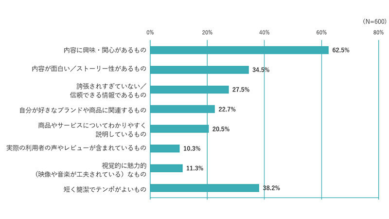 続いて「ショート動画を見る場合どのような内容であれば最後まで見続けたいと思うか」を質問。最も多かったのは「内容に興味・関心があるもの」となり、次いで「短く簡潔でテンポがよいもの」となった。