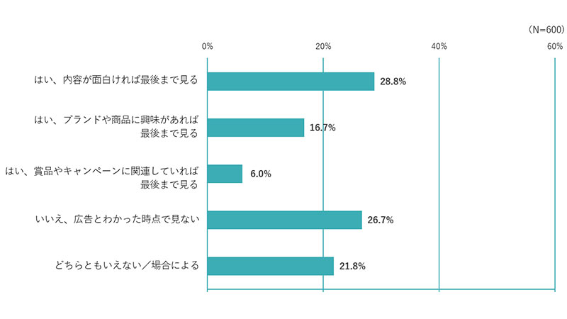 広告とわかっていても動画を最後まで視聴するかどうか聞いたところ、28.8%が「内容がおもしろければ最後まで見る」と回答。