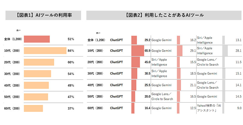 AIツールの利用経験についてたずねたところ、対象者全体の約半数が「利用したことがある」と回答。利用したことのあるAIツールとしては、全世代で「ChatGPT」が最も多く、生成AIの代表的な存在として定着しつつある状況が明らかとなった。