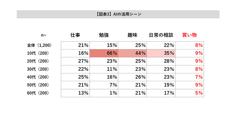 直近3カ月以内のAI活用目的を見ると、年代によって傾向に違いが見られた。特に若年層では勉強、趣味、日常の相談事など複数のシーンでAIを活用しており、活用範囲が広いことが特徴となっている。