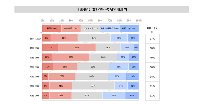 買い物やそのための情報収集にAIを「利用したい」「やや利用したい」と回答したのは全体で37%。若年層では、半数近くにのぼっている。