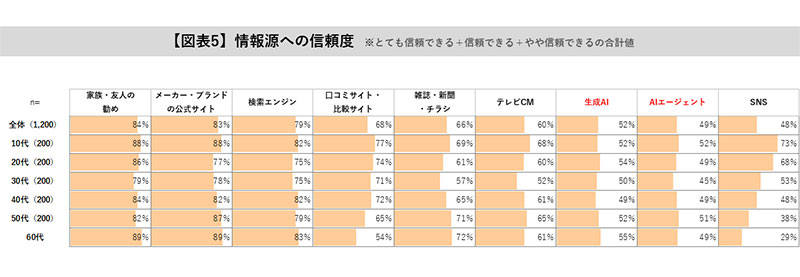また、生成AI・AIエージェントについて「とても信頼できる」「信頼できる」「やや信頼できる」と回答したのは全世代で約50%と、SNSと同程度の水準となった。テレビCMに次ぐ、信頼度であることが明らかとなった。