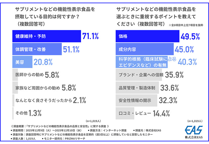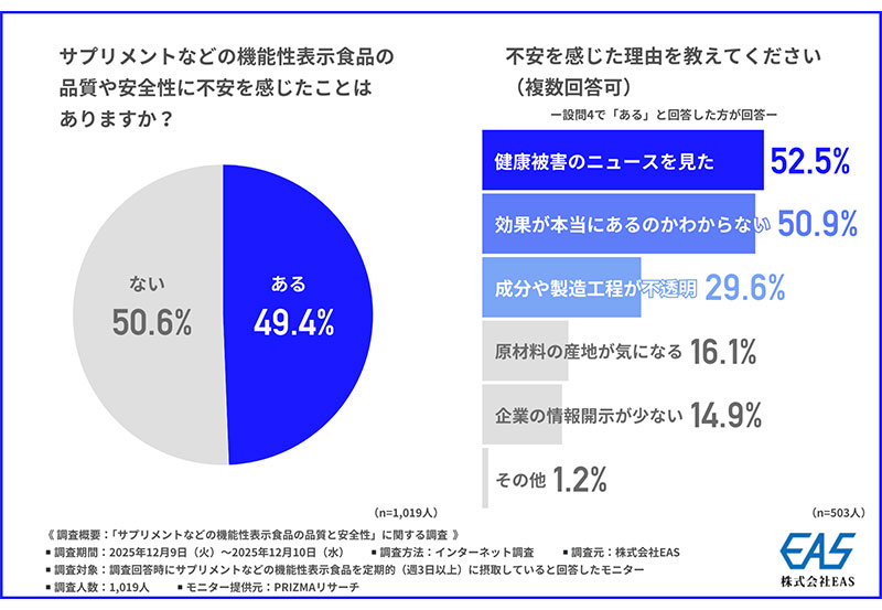 株式会社EASは2026年1月16日、「サプリメントなどの機能性表示食品の品質と安全性」に関する調査の結果を発表した。