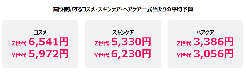 世代別で、普段使いしているコスメ・スキンケア・ヘアケア一式あたりの予算をヒアリング。コスメ一式の平均予算は、以下の通りとなった。