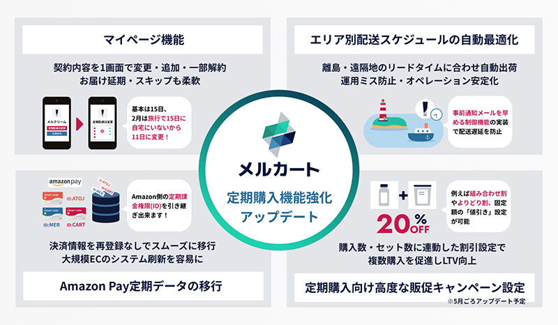 株式会社メルカートは2026年3月24日、提供するクラウドEC構築プラットフォーム「メルカート」の定期購入機能を大幅に強化するアップデートを発表した。