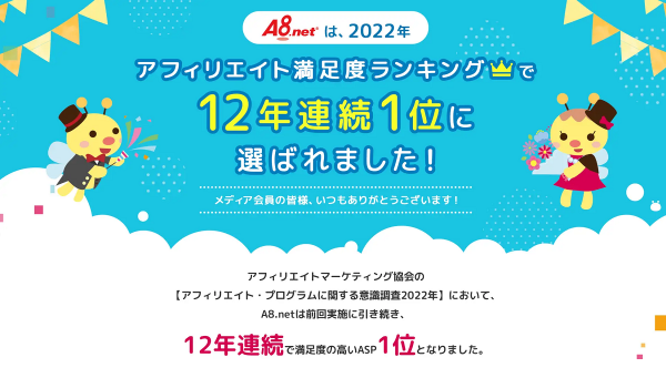 【A8ネット】12年連続でアフィリエイトASP満足度1位に
