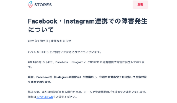 【続報あり】STORES、FB・インスタとの連携で障害...