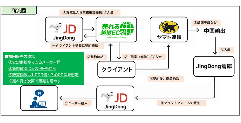 「中国向け買取仕入れサービス(以下、本サービス)」の骨子は、売れる越境EC社が日本国内の優良メーカー・ブランドを対象に商品を買取仕入れ。その商品をJD.comプラットフォーム上で中国消費者に販売するというもの。