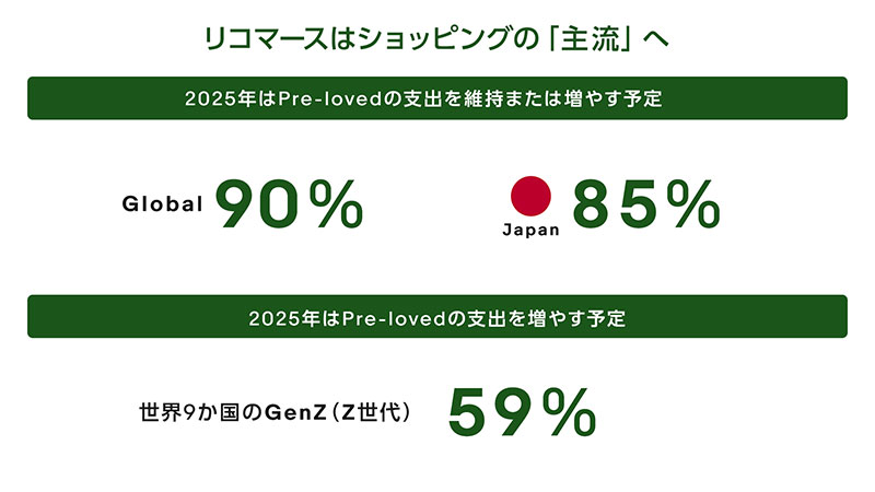 eBayの調査では、世界9カ国の消費者の90%が「2024年と比較して2025年はPre-lovedへの支出を維持または増やす予定」と回答。日本においても85%が同様に回答しており、リコマースはニッチなトレンドではなく世代を超えて、文化・経済・ライフスタイルの“当たり前な選択肢”になりつつある。