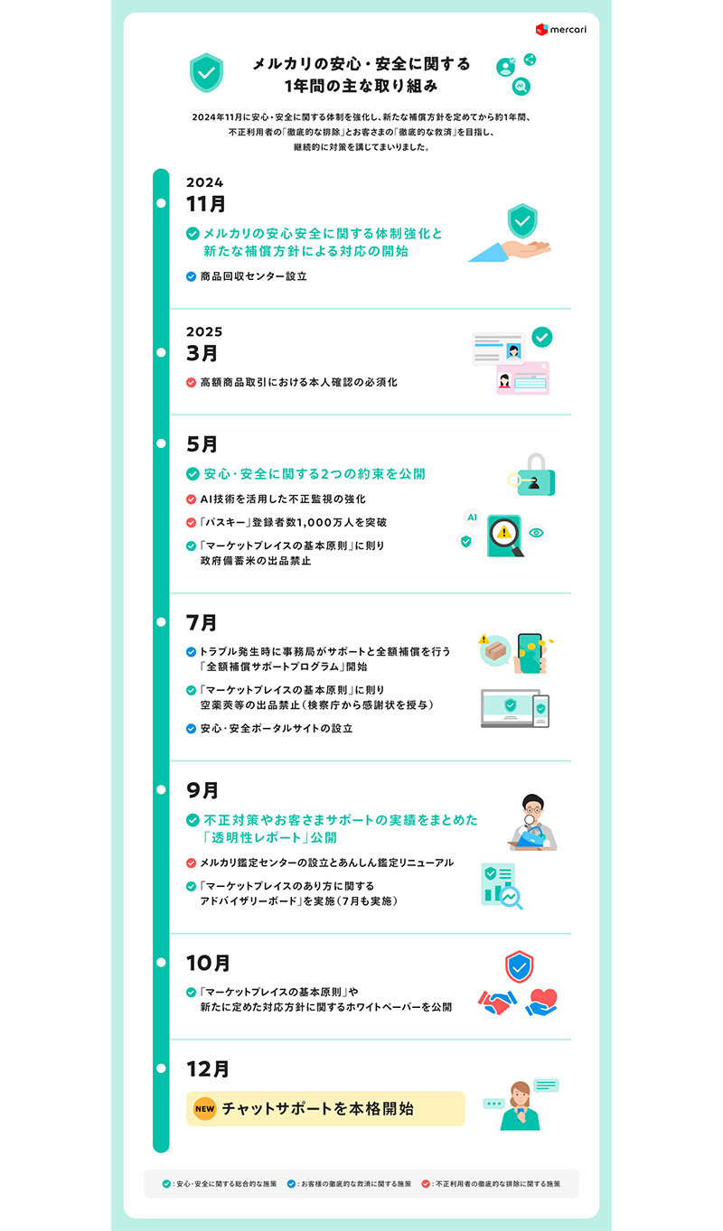 メルカリは2024年11月に安心・安全に関する体制を強化。新たな補償方針を定めてから約1年間、不正利用者の「徹底的な排除」と顧客の「徹底的な救済」を目指し、継続的に対策を講じてきた。