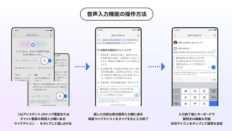 「AIアシスタント」機能の入力方法として、これまでのテキスト入力に加え、音声入力にも対応している(※2)。